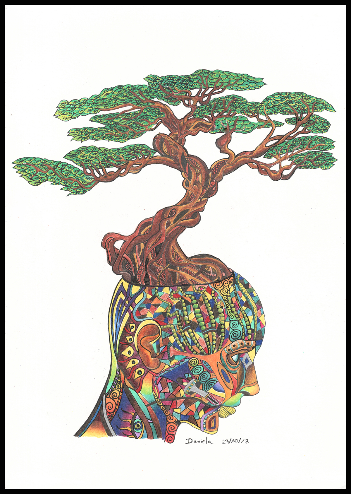 Daniela: I started to draw fantasy worlds and things that were far from reality already in the early years of elementary school. I like to use many different techniques, colour pencils, ink, black pens, acrylic paint. And often I use many of them at once, combined.