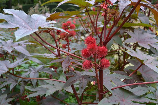Ricinus communis is a very common plant on Gran Canaria. It grows high, has large leaves, which might have green or red color. The seeds are called the ricinus beans, which is the main source of the ricinus oil. The plant is very toxic and extremely allergenic, and has an OPALS allergy scale rating of 10 out of 10. The plant is also a very strong trigger for asthma. It grows very fast, and gives a nice look of gardens, but be very careful with it.